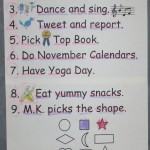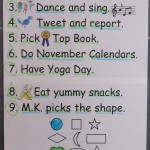 Rachel: We got to do a Downward Dog in Yoga. We got to do a new kind of Table (pose). Run, Turkey, Run! won Top Book. I picked Run, Turkey, Run! We had bananas and crackers for snack. I picked 8 (on Pocket Chart Attendance). We read Don’t Get Lost! today. The little pig wanted to go on a walk after she ate her breakfast. Her mother said, “Yes! But don’t get lost and be back in time for dinner.” The sheep wanted to go with Piglet and the mom said, “Yes! But don’t get lost and be back in time for dinner.”