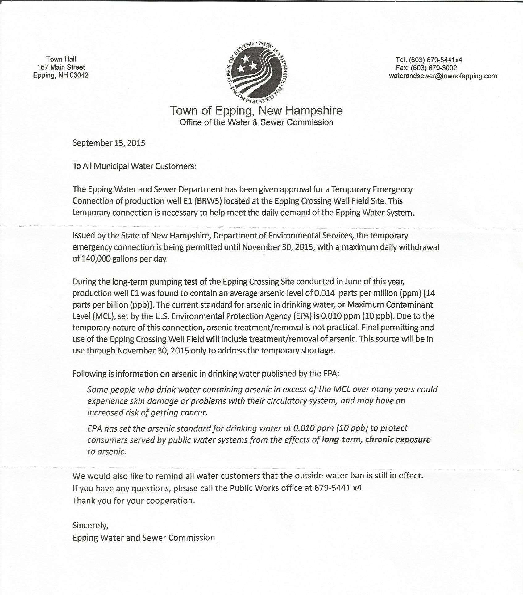 I picked up a letter at the post office on Friday afternoon, September 25th from The Town of Epping which is self-explanatory. (See below.) It’s dated September 15th, but wasn’t mailed until September 23rd. Although the Town seems to make it clear that this very short-term usage at such slight elevations of arsenic should not pose any risk to any Townspeople, I’m choosing to act with an abundance of caution. In response to the slightly elevated arsenic levels in the town water, the Hogarth children will consume only bottled water until the situation is remedied in early December after the new well goes into production. If you have any questions, I suggest you contact the Public Works office at the number listed in the letter.
