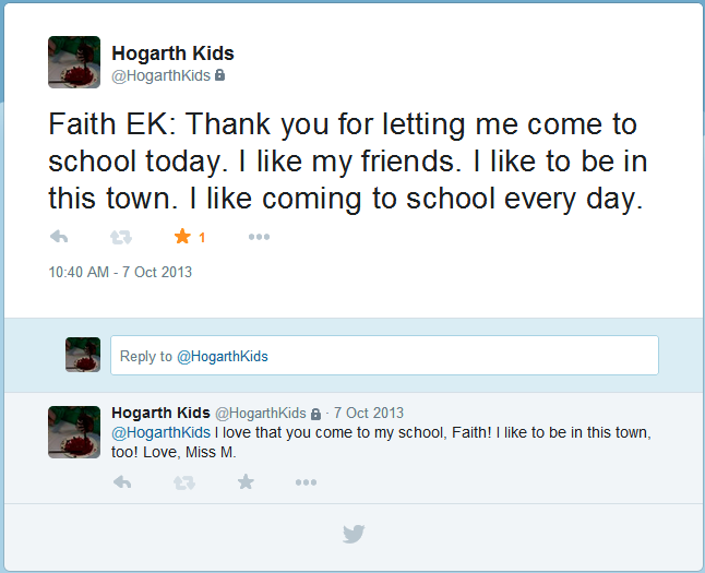 FathTweetLiz will move on to the larger world of regular school, but we will greatly miss the wholesome, happy atmosphere you created at Hogarth.  R.S., Satisfied Hogarth Parent