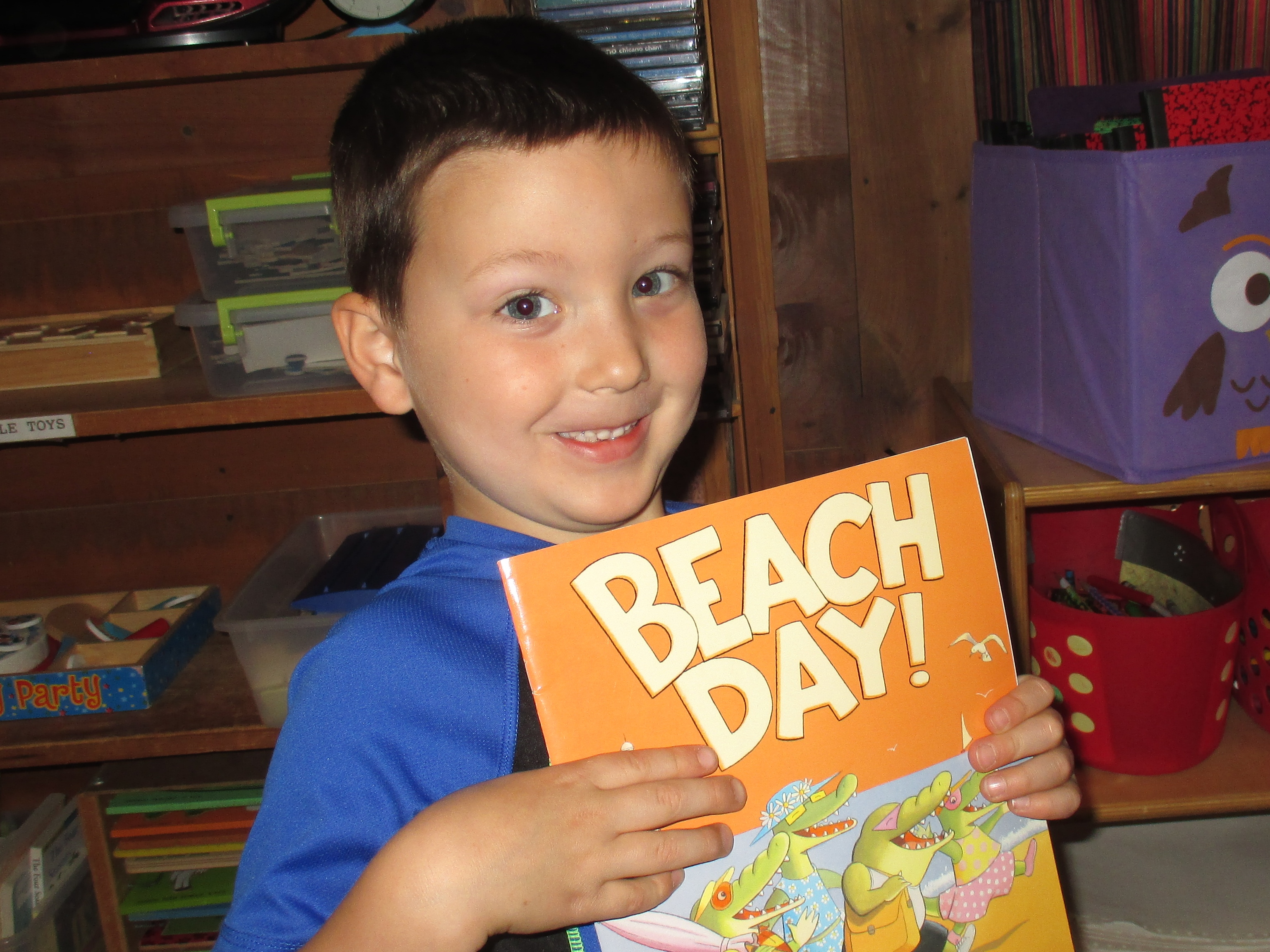 Logan: We read a soft cover book and it was called Beach Day! (Italicized print that follows is Logan reading directly from the book.) “Hot!” said Sam. “Sunny, ” said Pam. “Sweaty,” said Will. “Swim?” said Jill. “Beach!” said Sam, Pam, Will, and Jill. They decided to go to the beach and they were going to play because they saw a park. And they pedaled up and down and under and even through a mountain of clover. And then one said, “Picnic.” “Sandwich,” said Sam. “Pasta,” said Pam. “Pickles,” said Will. “Burp!” said Jill. They napped and then they slept past 1 and they slept past 2 and they slept past 3 and they slept past 4. “Let’s go!” said Sam. “But where?” said Pam. “Over there!” said Will. That hill?” said Jill. “Push!” said Sam, Pam, Will, and Jill. “Beach!” said Sam, Pam, Will, and Jill. They swam by the light of the moon.
