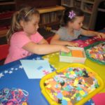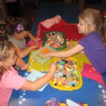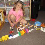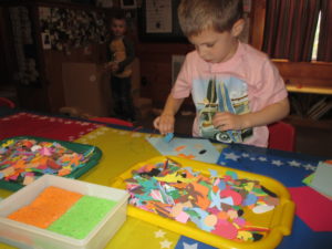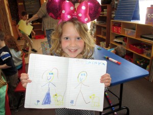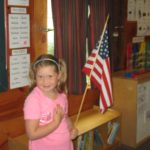 Hazel: We made kites. Miss Vicki put the string on for me and I got the same thing as Alba. The same thing, but not the same size. Actually, it is the same size. I put an aqua flower on it and a bunch of stuff on it. I did holding the flag and we did Pledge of Allegiance together with Miss Murphy and Miss Vicki. I played in the yard over there at the end of Miss Murphy’s desk. I put animals in it and I made a huge yard!