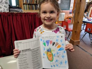 The children journal most weeks starting in late fall. The journals are an outlet for self-expression, but also serve as a vehicle to work on letters and letter sounds, and numbers and their functions. The children often dictate text for me to add to their drawings. The next blank page in the journal is marked in the corner with a little sticker. This allows the children to find the page for their next journal entry. They know the blank stickered page is their journal page for the day. I created a playlist with writing-related songs to play while the children journal. The children write as long as the music plays in the background. When the music is done, they can be finished. Having a “frame” for the activity encourages children to take a deeper dive, but there are always children who want to work beyond the alloted time. Cries of, But I’m not done! ring out when the music stops. We always offer them a work space in which to continue their journaling. Journals are sent home when a child “graduates” from Hogarth, so some children will work up to three years on their Journal. It is always fun and informative to see the developmental progression of the children’s work as they move through their school year(s).